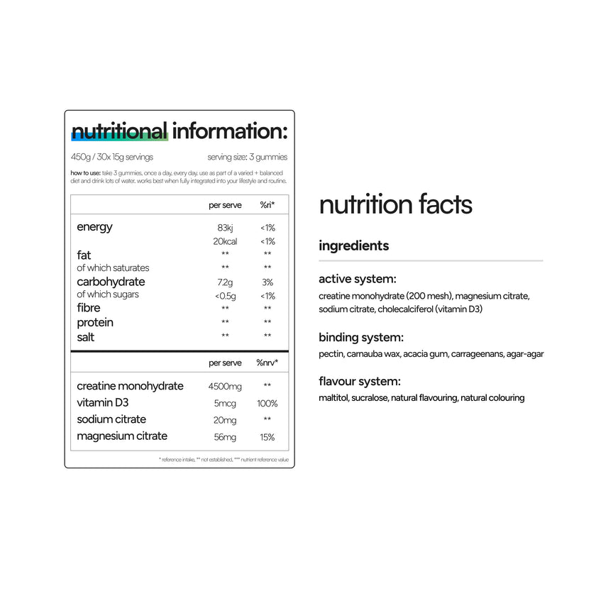 THE TRUTH: Loading phases (20g daily for a week) are unnecessary and often cause stomach discomfort. Studies show taking 3-5g daily achieves the same muscle saturation in 3-4 weeks without the side effects. Daily intake of 3-5 gummies keeps it simple and comfortable.